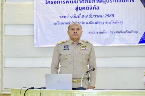 วันที่ 8 ธันวาคม 2568 นายประโมทย์ ดำจวนลม พัฒนาการจังหวัดพัทลุง พร้อมด้วยนายวีระ เพ็ญจำรัส ผู้อำนวยการกลุ่มงานส่งเสริมการพัฒนาชุมชน และเจ้าหน้าที่สำนักงานพัฒนาชุมชนจังหวัดพัทลุง ร่วมดำเนินโครงการ “พัฒนาศักยภาพผู้ประกอบการสู่ยุคดิจิทัล” ณ โรงแรมลำปำรีสอร์ท อำเภอเมืองพัทลุง โดยได้รับเกียรติจาก นายธราวุธ ช่วยเกิด รองผู้ว่าราชการจังหวัดพัทลุง เป็นประธานในพิธีเปิด และมอบโอวาทแก่ผู้เข้าร่วมอบรม ประกอบด้วยผู้ประกอบการ OTOP ผู้ประกอบการรายย่อย และเจ้าหน้าที่พัฒนาชุมชน จำนวน 61 คน