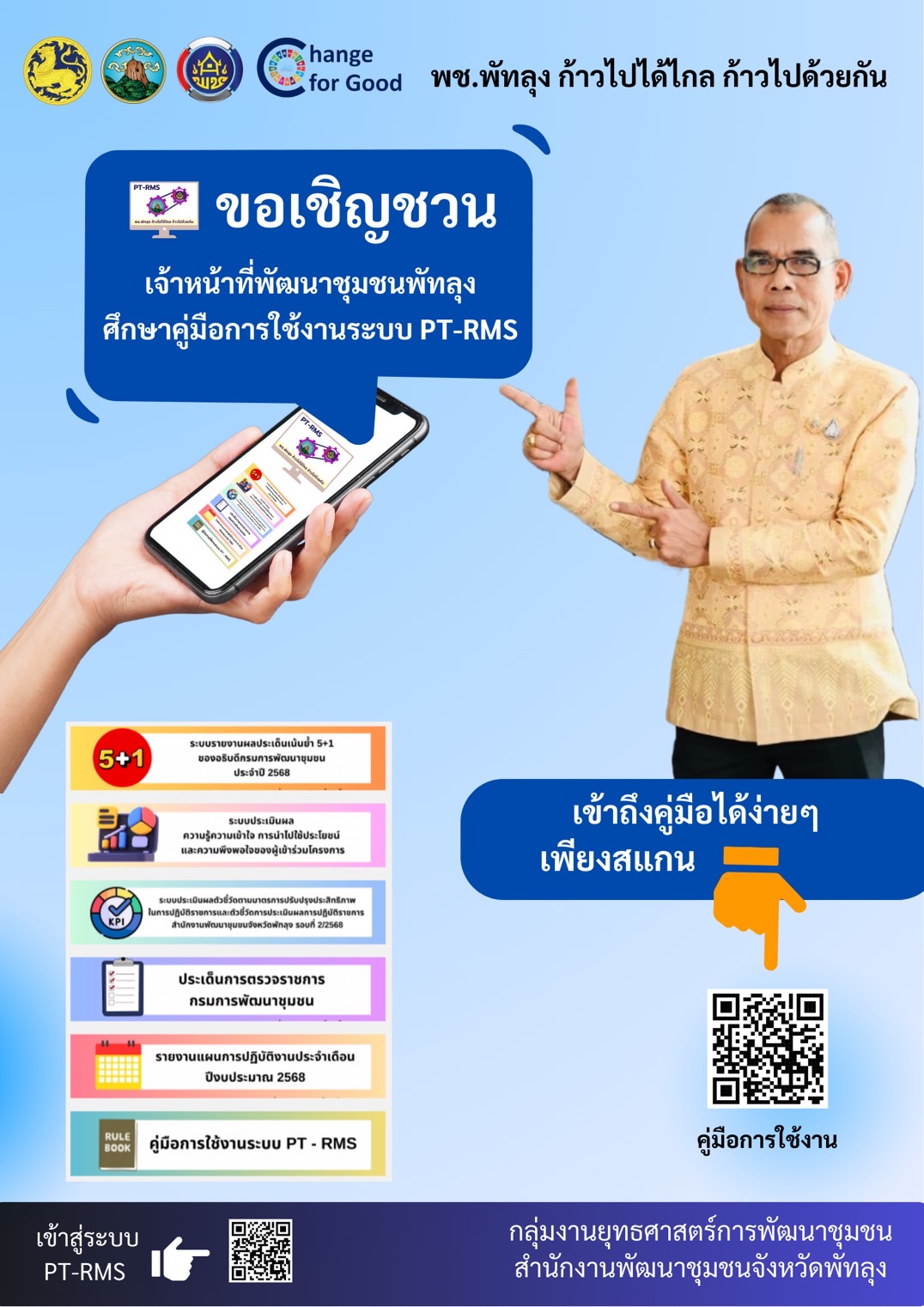 พช.พัทลุง ร่วมประชุมกรมการพัฒนาชุมชน ครั้งที่ 10/2568 ผ่านระบบวีดิทัศน์ทางไกล (Video Conference) พช.พัทลุง ร่วมกับอำเภอตะโหมด ลงพื้นที่มอบสิ่งของช่วยเหลือครัวเรือนยากจนและกลุ่มเปราะบาง อำเภอตะโหมด พช.พัทลุง ร่วมพิธีสรงน้ำพระบรมศพ สมเด็จพระบรมราชชนนีพันปีหลวง ในพระบาทสมเด็จพระวชิรเกล้าเจ้าอยู่หัว พช.พัทลุง ลงพื้นที่ติดตามผลการดำเนินงานโครงการสนองพระราชดำริโครงการอนุรักษ์พันธุกรรมพืชอันเนื่องมาจากพระราชดำริ สมเด็จพระเทพรัตนราชสุดาฯ สยามบรมราชกุมารี (อพ.สธ.) กิจกรรมการขยายผลการจัดทำแปลงอนุรักษ์พันธุกรรมพืช พช.พัทลุง ร่วมกิจกรรมวันปิยมหาราช ประจำปี 2568 พช.พัทลุง ร่วมกิจกรรมจิตอาสา ถวายเป็นพระราชกุศล เนื่องในวันปิยมหาราช 23 ตุลาคม 2568 พช.พัทลุง ร่วมกิจกรรมเปิดโครงการ “ส่งเสริมการท่องเที่ยวชุมชนเชิงสร้างสรรค์ (Creativity Tourism)” จังหวัดกระบี่ พช.พัทลุง ร่วมประชุมเตรียมความพร้อมงานทอดกฐินพระราชทาน กรมการพัฒนาชุมชน ประจำปี 2568 ผ่านระบบ Video Conference พช.พัทลุง ลงพื้นที่เตรียมความพร้อม โครงการส่งเสริมการท่องเที่ยวชุมชนพื้นที่มรดกโลกลุ่มน้ำทะเลสาบสงขลา (นครศรีธรรมราช พัทลุง สงขลา) พช.พัทลุง ร่วมประชุมคณะกรรมการพนักงานเทศบาลจังหวัดพัทลุง (ก.ท.จ.พัทลุง)